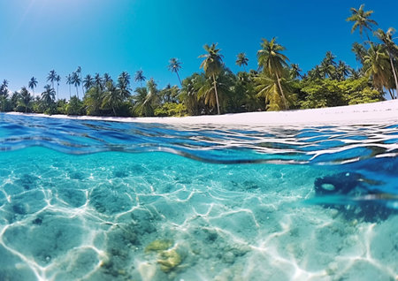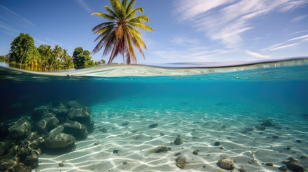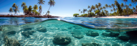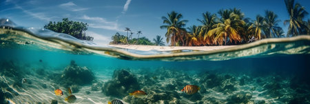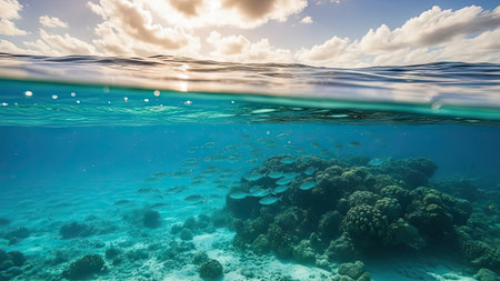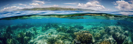 ocean panoramic view from under the water is a unique and mesmerizing perspective that offers a stunning contrast between the vibrant, colorful world below the surface and the vast, serene expanse of the sky above. With the visible border of the water, this view captures the beauty of the interplay between these two worlds, creating an unforgettable experience. Generative AI