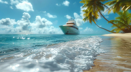 Tropical vacation concept with palms and blue ocean and small private yacht background.AI Generative.