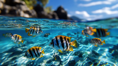 An enchanting underwater scene showcasing vibrant tropical fish and colorful coral reefs in crystal clear water. Ideal for nature lovers and aquatic enthusiasts.