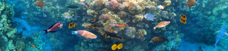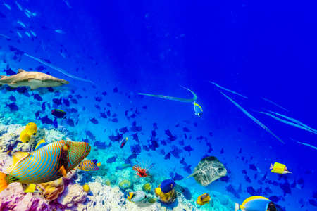Underwater colorful tropical fishes at coral reef at Red Sea - bluecheek butterflyfish, Pale damsel, sergiant, desjardin sailfin tangfish or Zebrasoma desjardinii