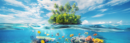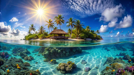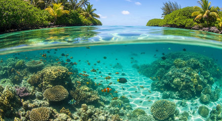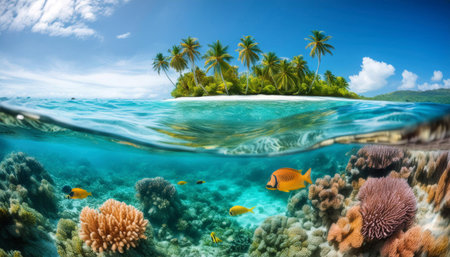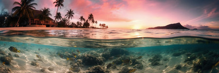Half-above and half-below water view of a tropical island with vibrant coral reefs and fish, clear blue waters, and a setting sun casting a warm glow