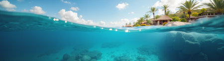panorama of a beach resort and underwater world at the same time, dividing the image into upper and lower parts by a wave
