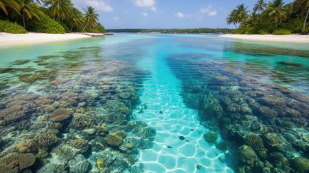 This image showcases a tranquil scene of clear turquoise water meeting a sandy beach, framed by lush green palm trees. The composition captures the natural beauty, displaying a variety of aquatic life beneath the surface. Suitable for use in travel, tourism, and environmental projects.