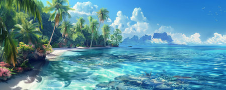 A tranquil island paradise background with crystal-clear waters, white sandy beaches, and the textures of palm trees and coral reefs, creating an exotic setting.