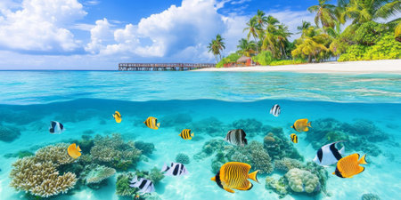 A tropical island surrounded by turquoise waters and coral reefs. White sand beaches are dotted with palm trees, and colorful fish swim near the shore. In the distance, a small wooden pier extends into the clear blue sea.