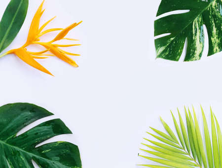 Tropical top view summer botanical concept still life white frame with monstera liana, vine, palm leaves and plumeria frangipani flower flat lay layout