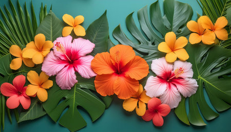 Colorful tropical flowers and palm leaves on green background. Flat lay, top view