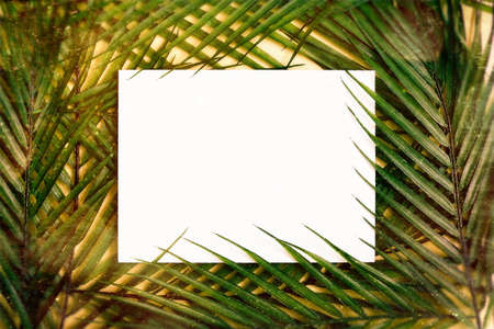 Minimal summer concept with palm tree leaf. Creative copyspace with paper frame. Creative layout made of colorful tropical leaves on white background.