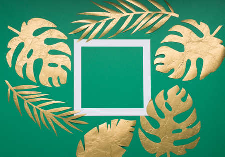 Festive holiday greeting card template. Golden tropical leaves Monstera and empty paper white frame on green background. Christmas, new year, birthday concept. Flat lay, top view, copy space.