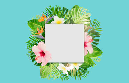 Tropical green leaves and flowers frame layout with copy space over aqua blue background