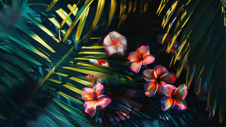 the flowers and the textures of the palm leaves. generative ai
