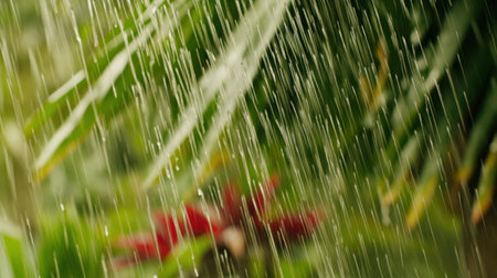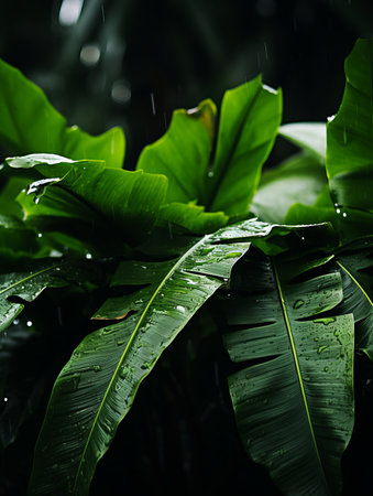 This image captures lush green tropical foliage adorned with raindrops during a heavy rainfall, creating a serene and vibrant atmosphere in nature.