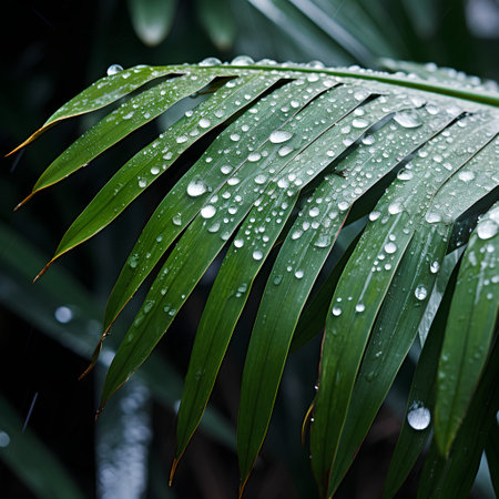 Close-up of wet palm leaves with dewdrops in lush green background, nature and freshness concept