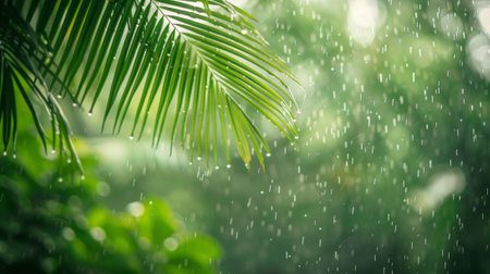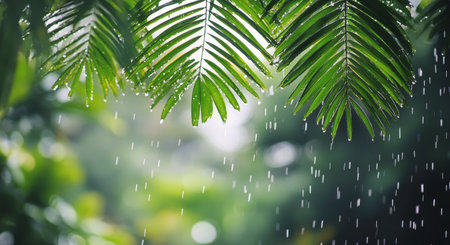Drops of rain cascade from vibrant palm leaves, capturing the essence of a tropical forest. The refreshing atmosphere is filled with the sounds of nature during a gentle rain.