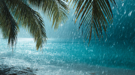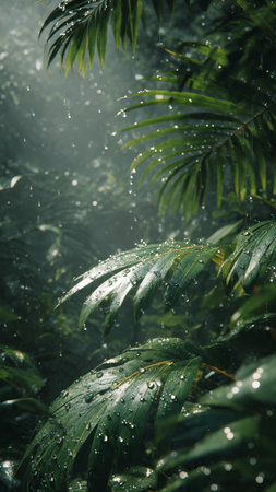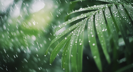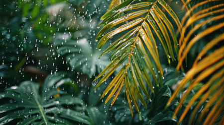 Heavy rain falls through vibrant palm leaves, creating a soothing atmosphere in a tropical rainforest. Water droplets gather on the leaves and drip down, enriching the lush environment.