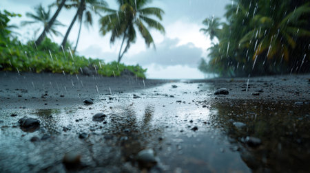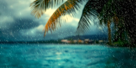 Rain falls gracefully on a peaceful beach while palm trees sway gently in the wind