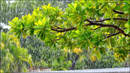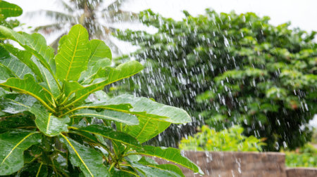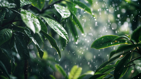 Heavy rain showering tree leaves in the jungle, with water droplets captured in motion, and space for adding text or design elements