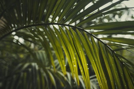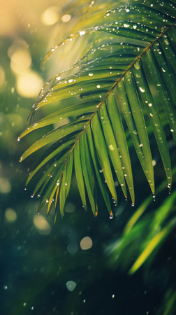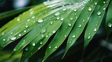 Close-up of green palm leaves with raindrops, nature and freshness concept
