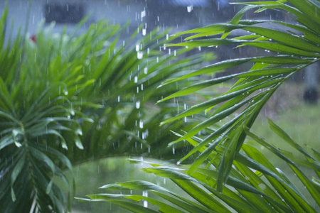 Rain on palm leaves from a heavy tropical rain in rainy season monsoon season in Philippines Asia