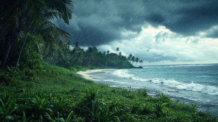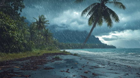 Tropical storm, typhoon, heavy rain, high winds in tropical climates. Climate change, natural disasters, hurricane, tornado season, generative ai illustration