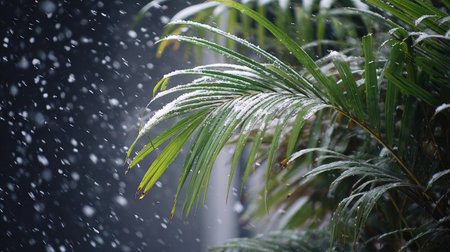 First snow falling gently on Areca palm, a few snowflakes drifting slowly and settling on the leaves; fresh air.