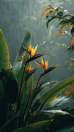 Bird of paradise in a storm, heavy rain pouring down, strong winds twisting their leaves, natural.