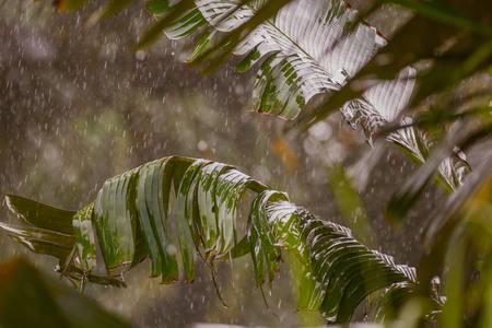 Green leaves in tropical rain with raindrops falling
