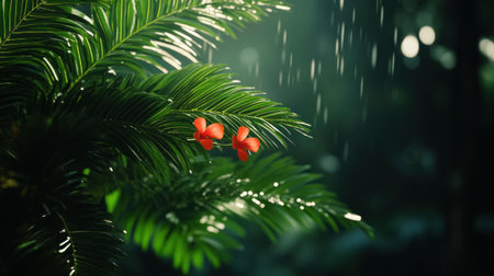 Raindrops gracefully fall on the bright green leaves of palm trees, creating a peaceful atmosphere in a tropical environment. The serene afternoon light enhances the vibrant colors.