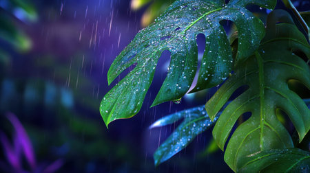 Wet tropical leaves under soft rain, glowing against a dim jungle backdrop