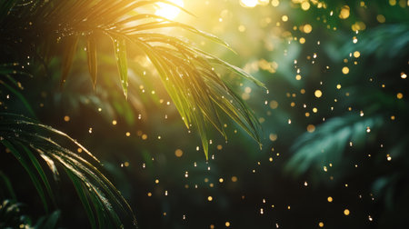Palm leaves falling mid-air with misty water drops glistening, tropical setting, soft warm lighting generative ai