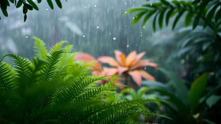 A peaceful rain falling in a tropical garden, with lush green plants soaking up the water.