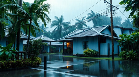 Cottage in the rain. Rainy day in the tropics.