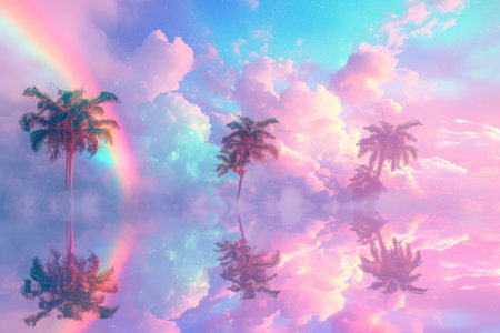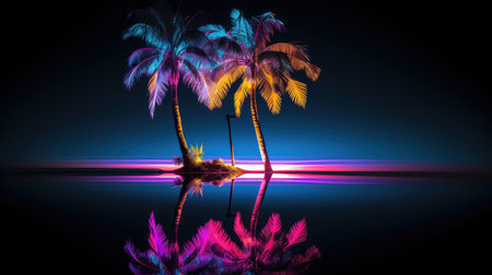 This image showcases a collection of palm trees rendered in a spectrum of vivid colors against a solid black background. The composition includes a reflective body of water, possibly a lake or ocean, enhancing the overall vibrant display. This image is suitable for use in design projects, advertising, or as visual elements.