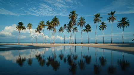 Discover a serene tropical island where palm trees sway gently beside pristine sands. The clear blue sky and fluffy clouds create a breathtaking reflection in calm waters.