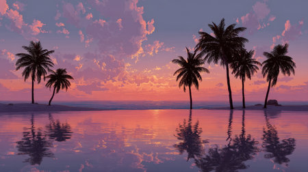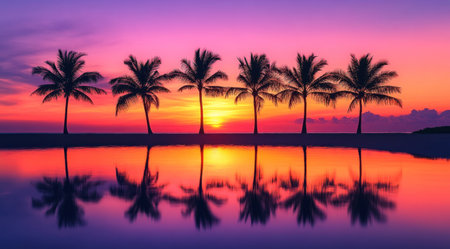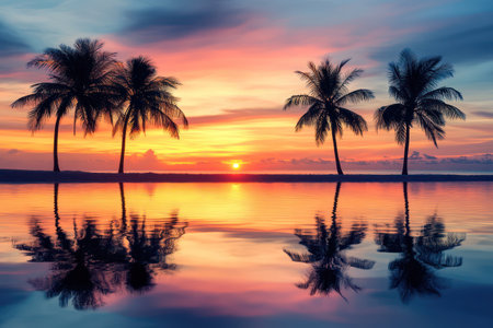 A stunning sunset scene featuring palm trees silhouetted against a colorful sky, with reflections on the tranquil water surface, creating a peaceful atmosphere perfect for relaxation.