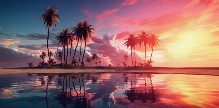 Tranquil Tropical Paradise. Idyllic Island Sunset Scene with Palm Trees and Serene Waters
