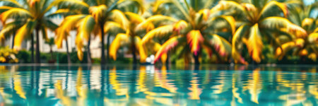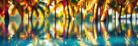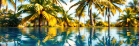 Tropical oasis with clear blue water and palm trees reflecting in sunlight