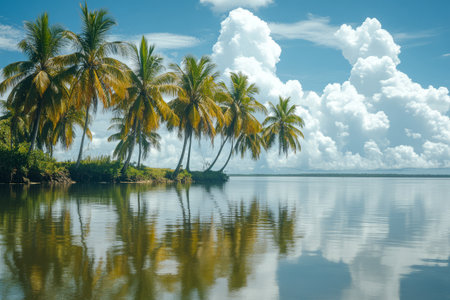 A tranquil tropical setting features tall palm trees alongside calm waters. Fluffy clouds reflect beautifully on the surface creating a peaceful atmosphere in nature.