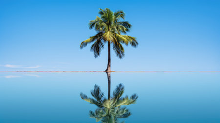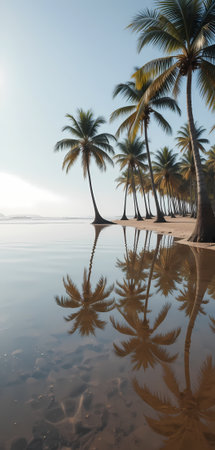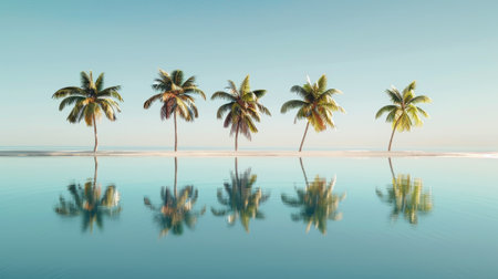 This beautiful coastal landscape features tall palm trees reflected in calm waters under a clear blue sky, perfect for showcasing tropical tranquility.