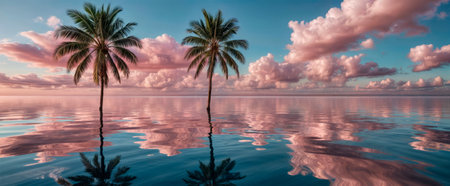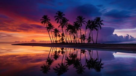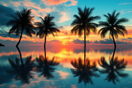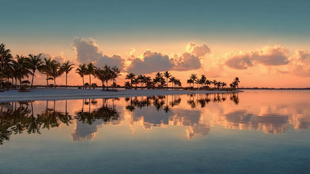 A stunning tropical beach scene displays a calm ocean reflecting the vibrant colors of sunset. Palm trees line the shore. The composition features a symmetrical reflection of the sky, clouds and trees in the water. This image is suitable for travel, vacation, and relaxation themes.