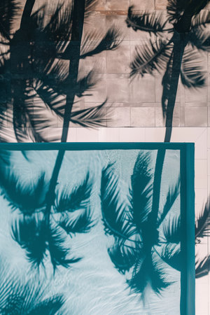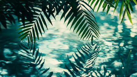 Palm leaves gently arch over turquoise water, showing the vibrant interplay of light and shadows beneath the surface, capturing a tranquil and serene atmosphere in a tropical paradise.