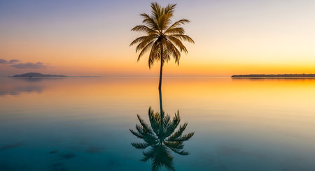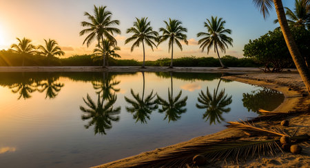 A serene tropical landscape featuring a row of palm trees perfectly reflected in a calm lagoon at sunset. The golden sun rays illuminate the water and sand, creating an idyllic and peaceful vacation paradise atmosphere.