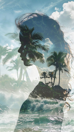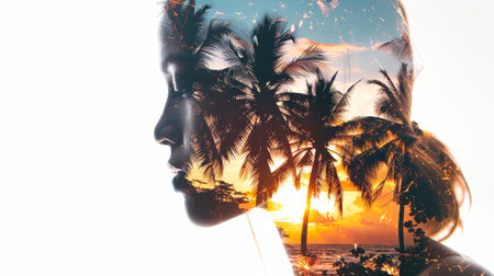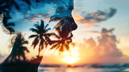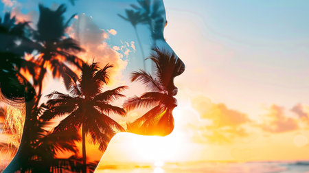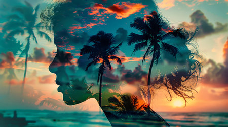 A womans profile is superimposed with a vibrant tropical beach scene, showcasing palm trees swaying against a sunset sky.