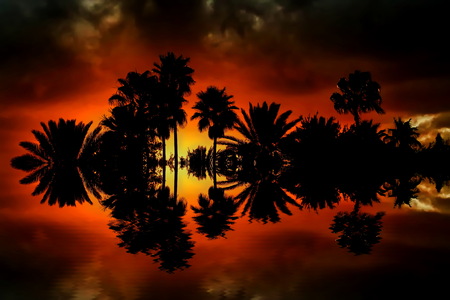 Palm tree silhouette with reflection on the water at sunset. Beautiful tropical landscape.