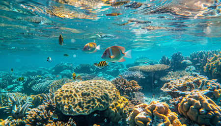 Colorful tropical coral reef with fishes and corals under sunlight.