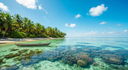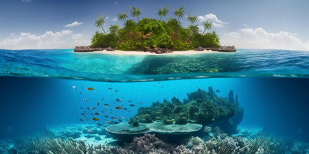 Stunning tropical island with vibrant coral reef and crystal clear water. Peaceful, summer paradise