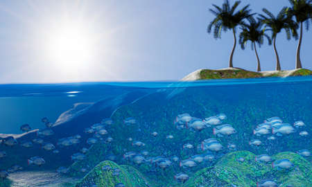 A group of fish underwater. An island in the middle of the sea with coconut trees. A group of fish in the middle of the sea with mossy rocks The sky is sunny during the day. 3D Rendering