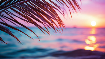 A stunning sunset viewed through palm leaves at a tranquil beach. The scene showcases vibrant colors, creating a serene and peaceful atmosphere perfect for relaxation.