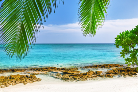 Tropical beach panorama with palm leaves on sand and sea