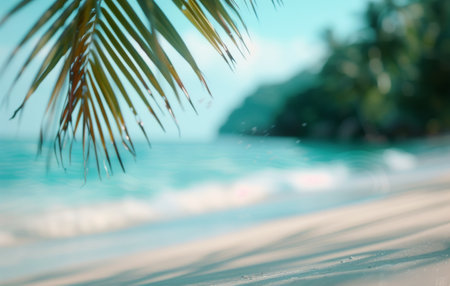 Palm tree branch swaying over a turquoise ocean, tropical beach setting generative ai